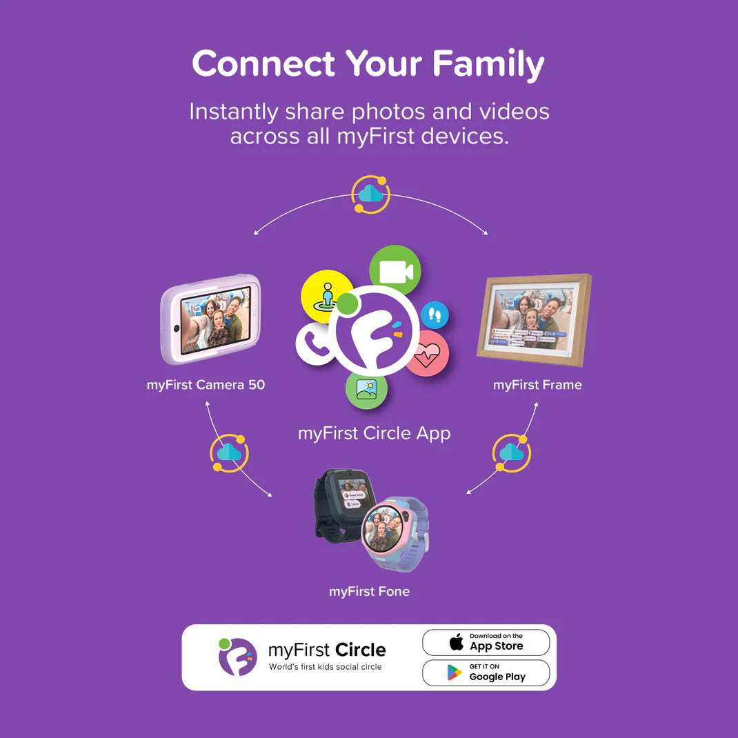 myFirst Circle is the world's first kid-friendly social app that securely connects children and families across all their myFirst devices, including watches, cameras, and digital photo frames. This private circle is built exclusively for family and trusted friends—no public access, no ads, and no strangers.